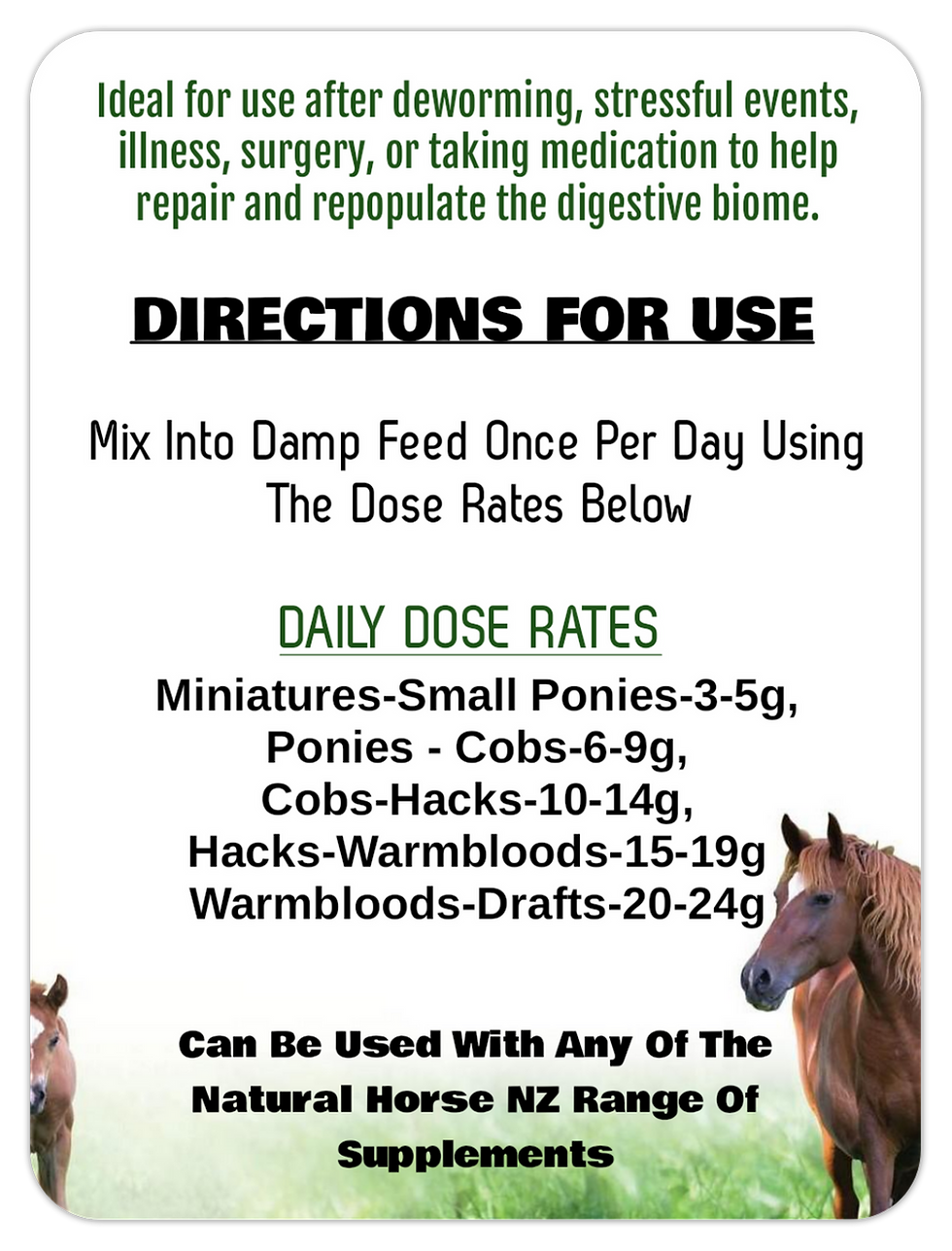 Natural Horse NZ will not be responsible for the incorrect use of this advice or products, as you are responsible for you and your equines safety so please follow the instructions and only use any items or advice in the recommended way.